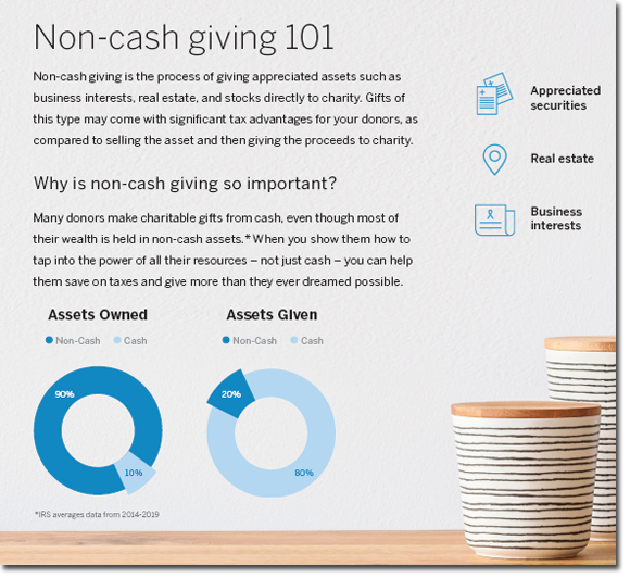 - Non-Cash Assets – as a broad category, you can think about giving from non-cash assets as a tax-advantaged strategy to take money you would likely have to pay for taxes, and give that money to a charitable organization like GCPN instead. Non-cash giving can come from Appreciated Securities (read more below); Real Estate; Business Interests; Personal Property; Restricted Securities; Loan Notes; Estate Gifts; Retirement Plans; and Life Insurance. Watch the NCF video (click above) and navigate to their Non-Cash Giving page here to learn more.